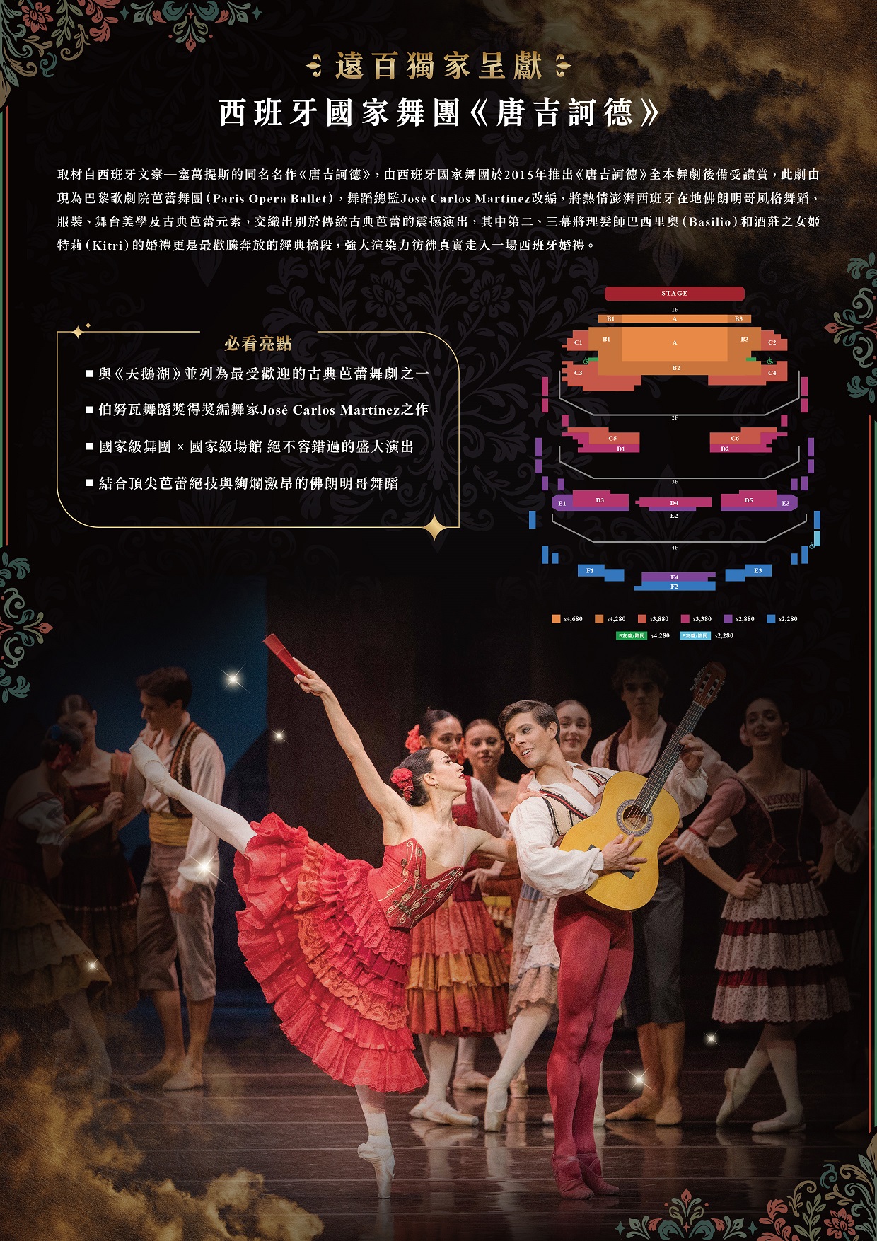 (二) 西班牙國家舞團自創立以來,歷經多位世界級藝術總監領軍,在古典與當代之間不斷拓展藝術疆界,兼具技術實力與文化深度。此次來台演出的《唐吉訶德》,更被視為舞團詮釋古典芭蕾語彙與西班牙民族精神的代表之作,充分體現其「以國家文化為根,與國際舞台對話」的藝術定位。