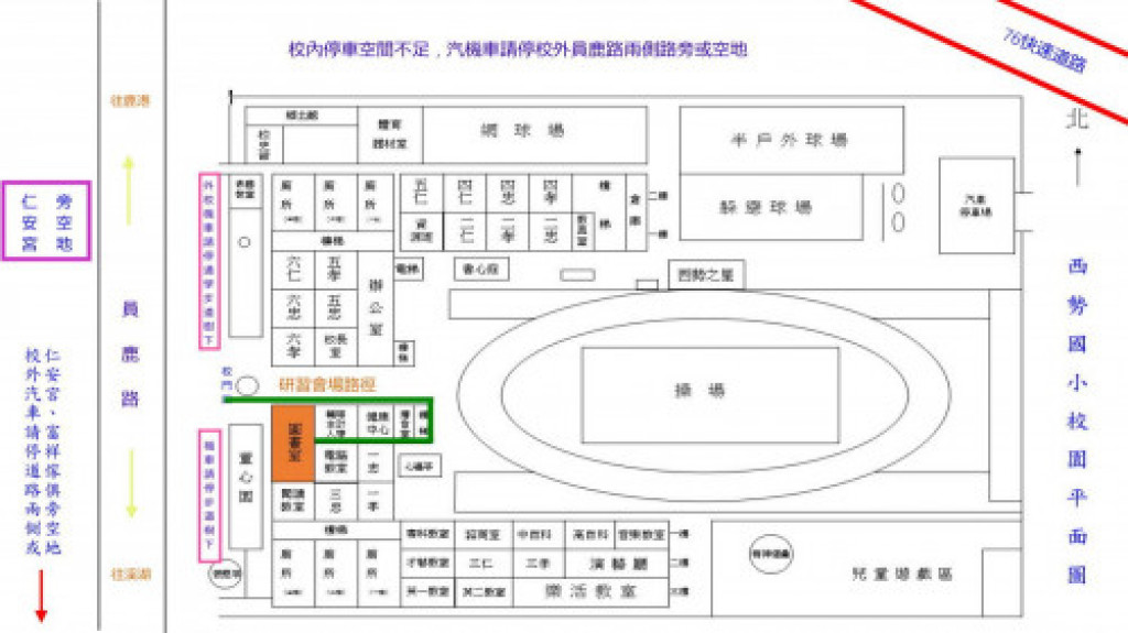 (三) 西勢國小校內停車空間不足,汽機車請停校外員鹿路兩側路旁或空地(如停車示意圖)。