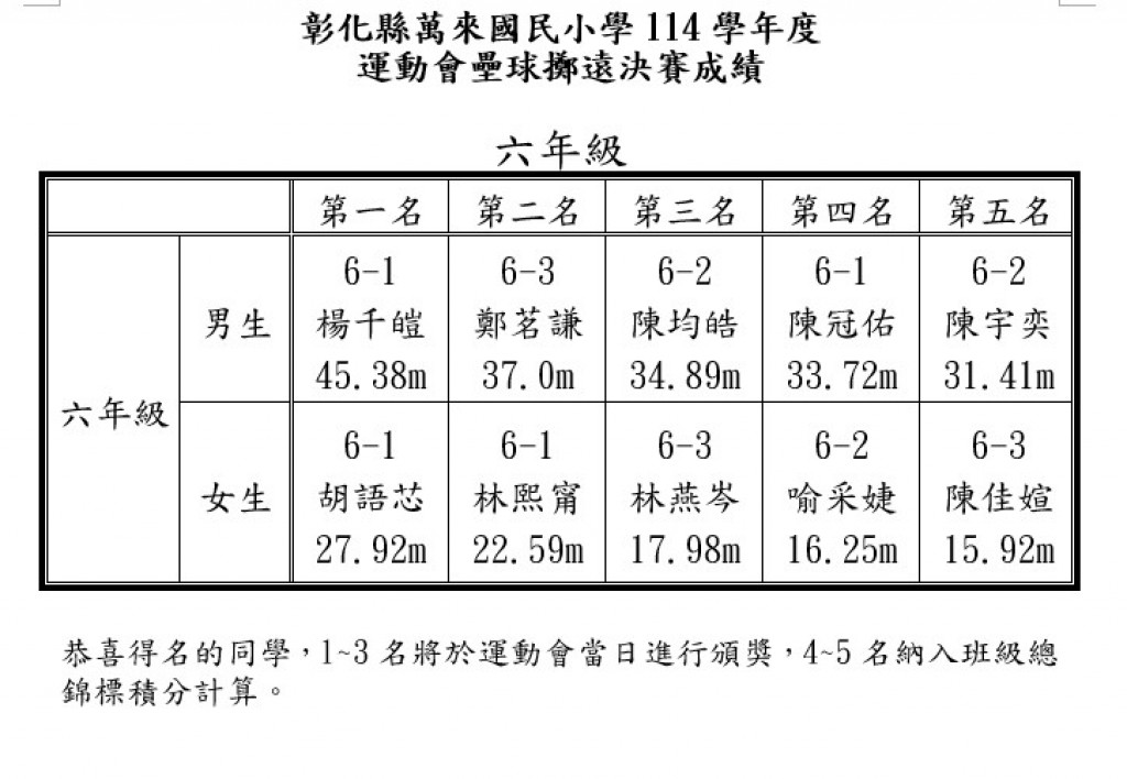 114學年度運動會六年級壘球擲遠決賽成績,恭喜得名的同學,1~3名將於運動會當日進行頒獎,4~5名納入班級總錦標積分計算。