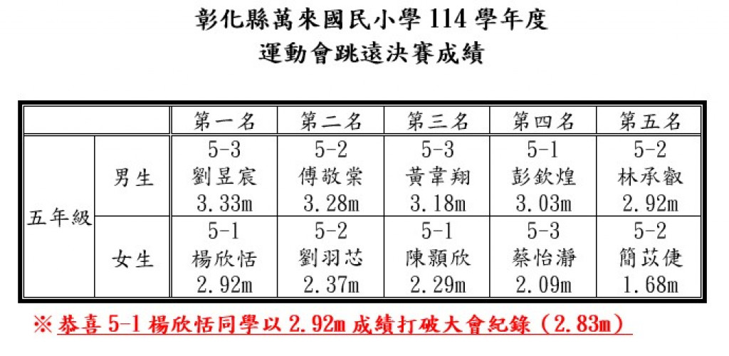 114學年度運動會五年級跳遠決賽成績,恭喜得名的同學,1~3名將於運動會當日進行頒獎,4~5名納入班級總錦標積分計算。