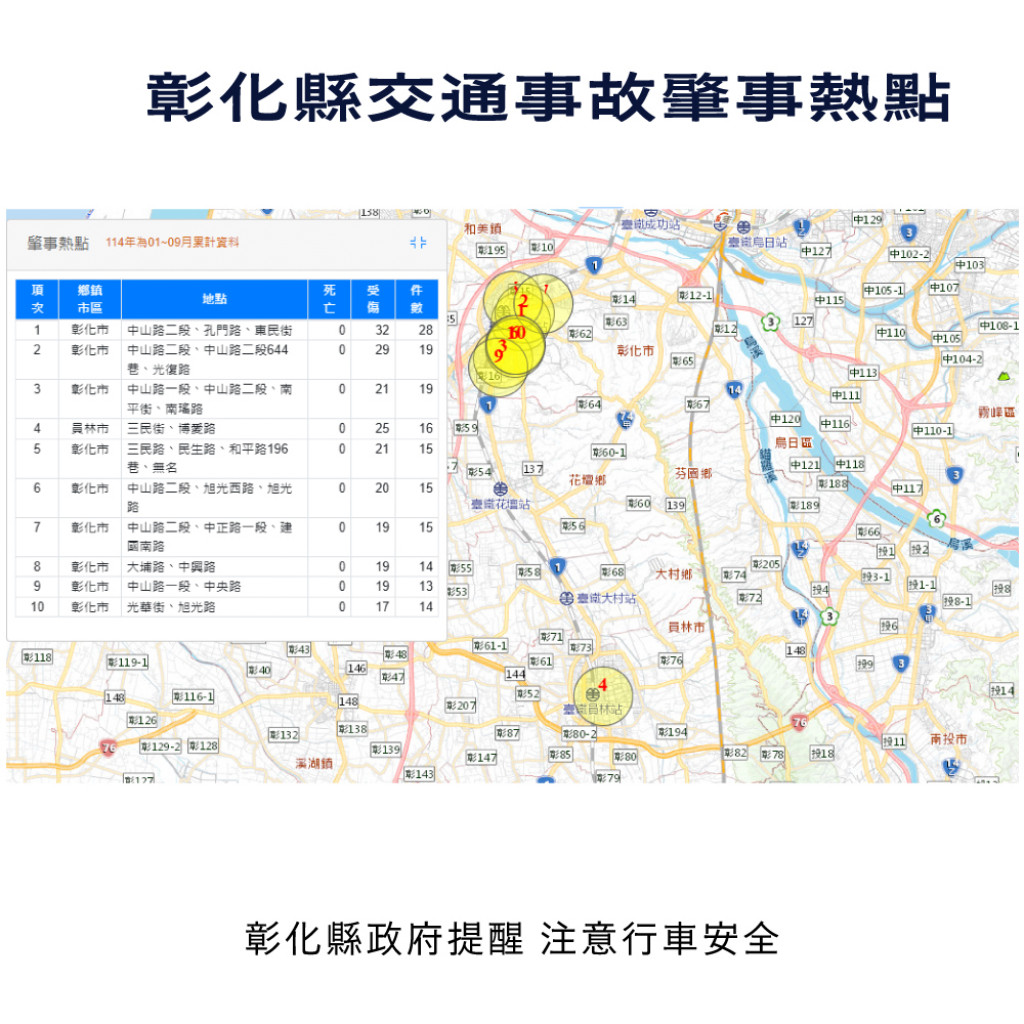 根據交通部道安資訊查詢網,本縣114年1-9月道路交通事故與112年同期比較分析,以少年自行車騎士(含電自、電輔) 事故增加45%最高,外籍人士事故增加34.3%次之,自小客車駕駛人增加26%再次之。1-9月份鄉鎮市30日死亡人數於「彰化市、員林市、二林鎮」為多,肇事熱點以「彰化市」為多,合先敘明。 |