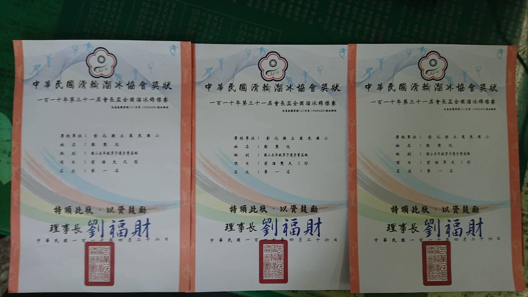 5年3班鄭秉迅同學參加第31屆會長盃全國溜冰錦標賽榮獲五年級男子菁英組前溜單足S形、前溜雙足S形、前溜交叉型,三項冠軍。