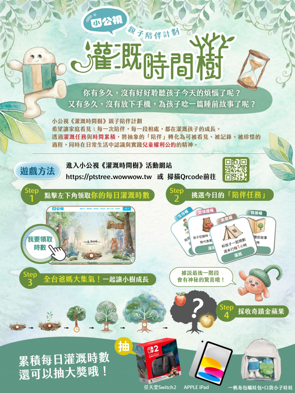 轉知:【小公視】「灌溉時間樹」線上親子活動,陪伴灌溉就有機會抽Switch2、iPad等多項好禮,請踴躍參與。