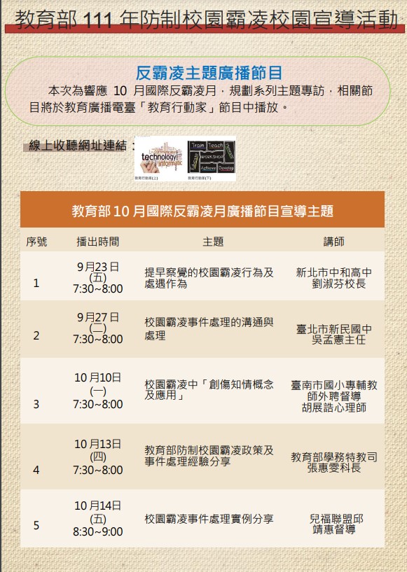 | 二、 | 為響應本(111)年度「國際反霸凌日」,教育部與國立教育廣播電臺「教育行動家」節目合作製播「防制校園霸凌主題系列專訪」,於本年9月23日至10月14日期間播出,節目中邀請具有推動校園霸凌防制工作經驗之專家學者進行專訪。 |